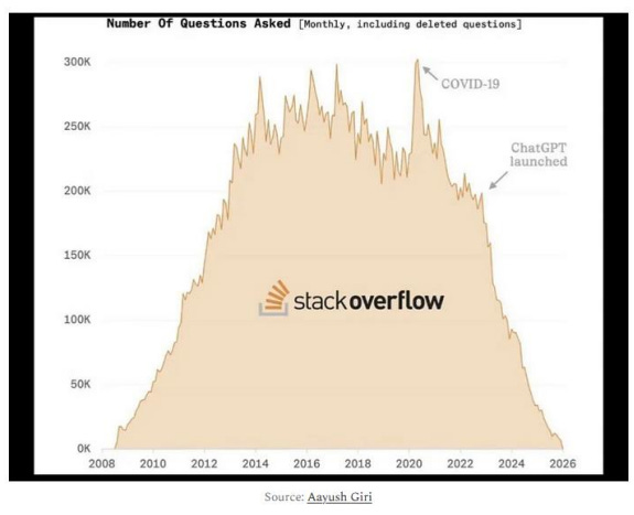 AI’s immense disruption of software is perhaps best shown in the number of questions asked on Stack Overflow over time: