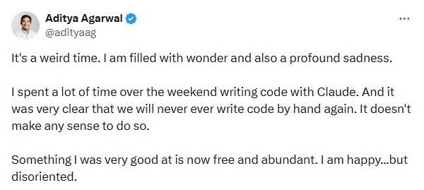The end of coding was perhaps best captured by this bittersweet tweet from Aditya Agarwal, former CTO of Dropbox.